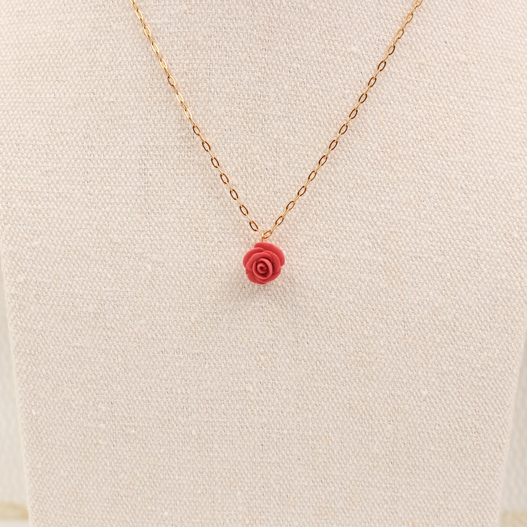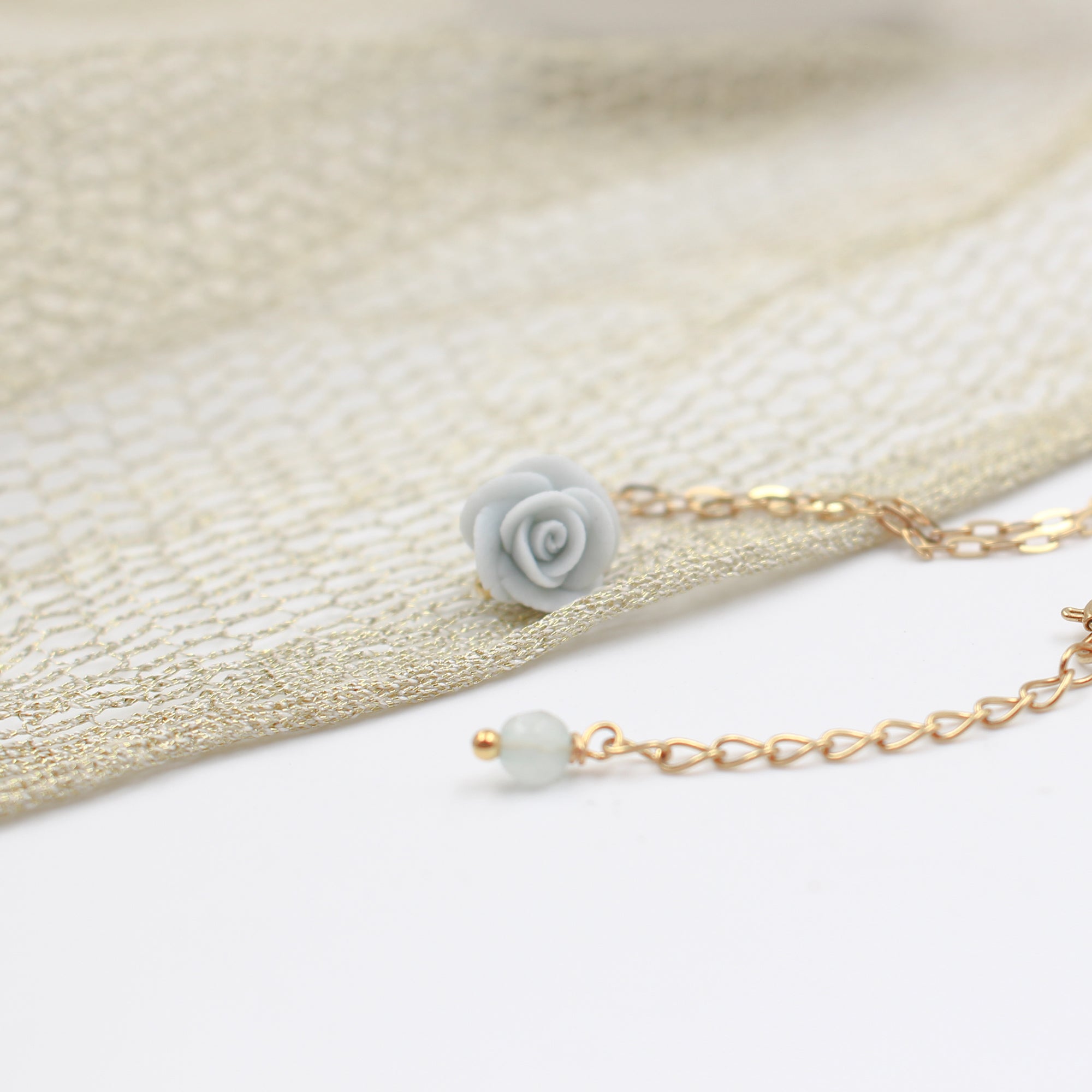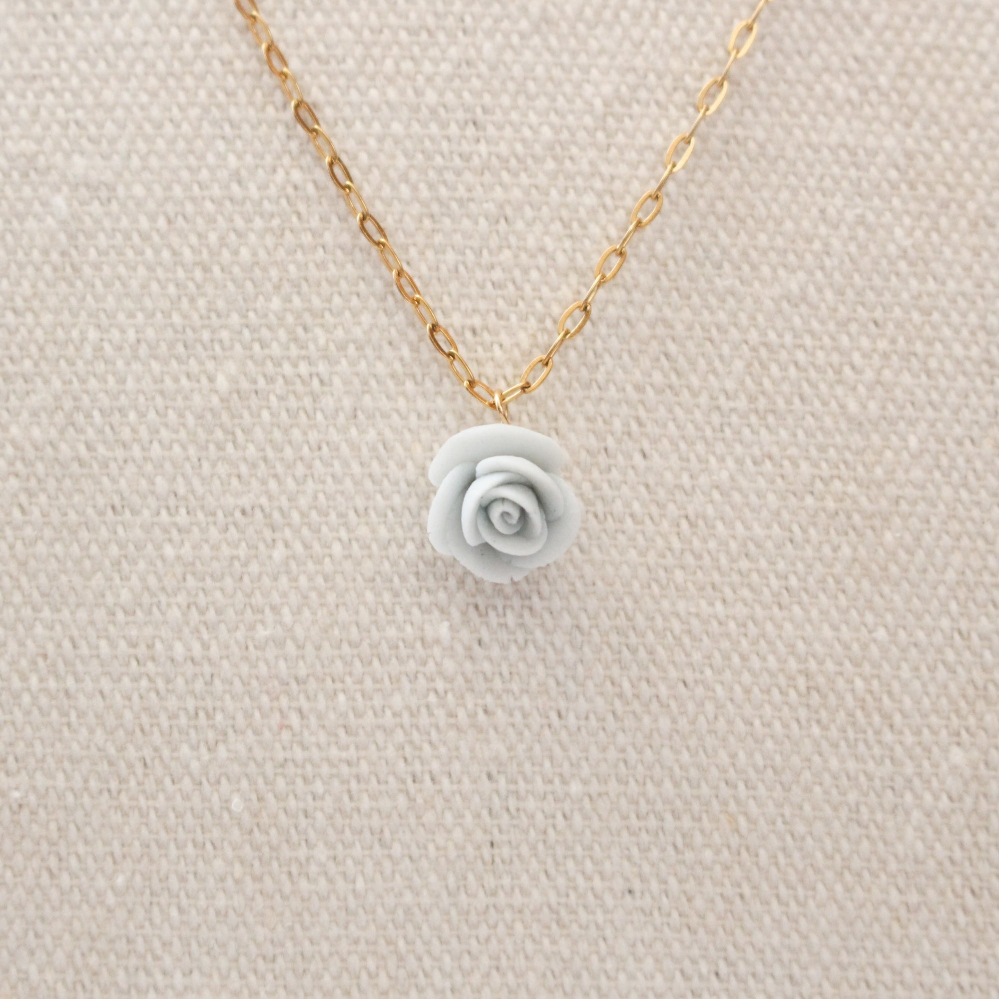 The chain is golden stainless steel, and the rose is handcrafted from blue/red biscuit porcelain.